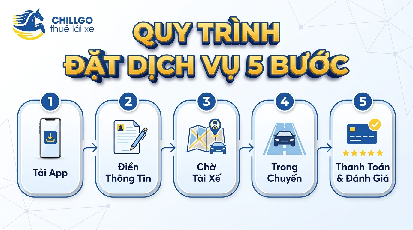 Đặt dịch vụ lái xe hộ ChillGo không phức tạp như bạn tưởng. Chỉ cần tải app, điền thông tin, nhận báo giá, xác nhận, và chờ tài xế tới – hết sức đơn giản. Từ lúc bạn nhấn “Đặt Dịch Vụ” cho đến lúc tài xế có mặt, toàn bộ quá trình chỉ mất 15-30 phút.